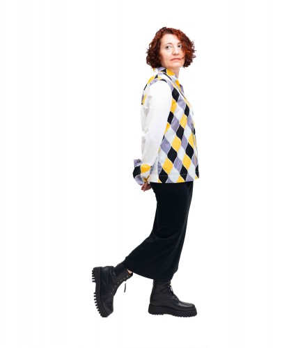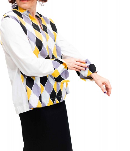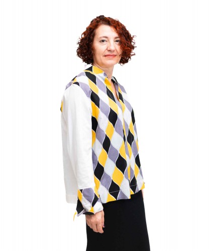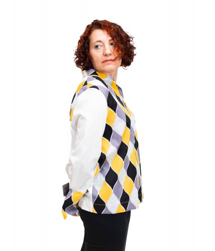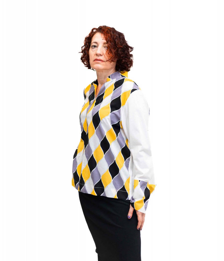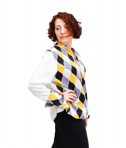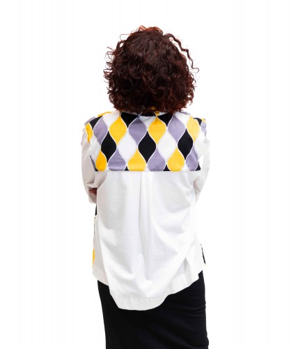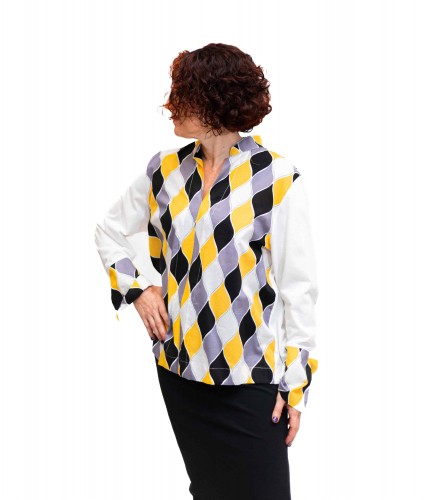 Elegante camisa de estilo 'ángel' con un diseño geométrico de rombos en tonos blanco, plata y amarillo. La combinación de colores crea un contraste sofisticado y moderno, perfecto para ocasiones especiales o para añadir un toque de brillo a tu look diario.