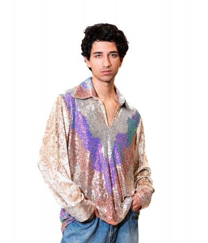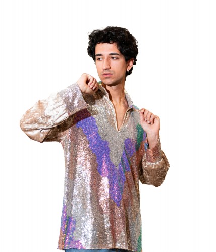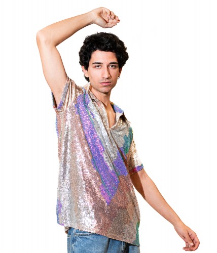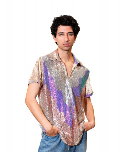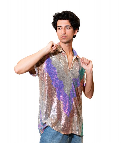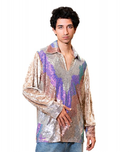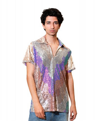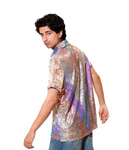 Elegante camisa de lentejuelas multicolores, diseñada para brillar en cualquier evento especial. Su tejido de alta calidad y corte favorecedor la convierten en una pieza única y versátil.