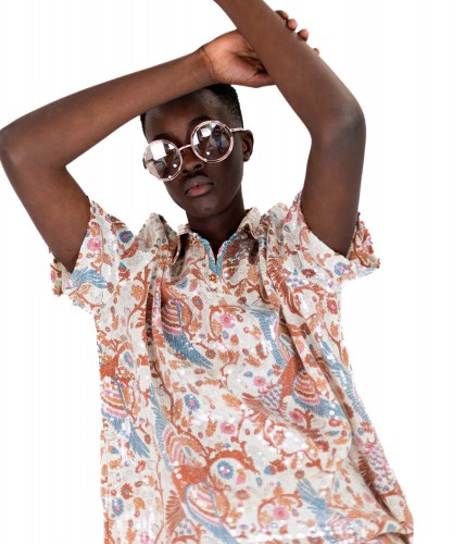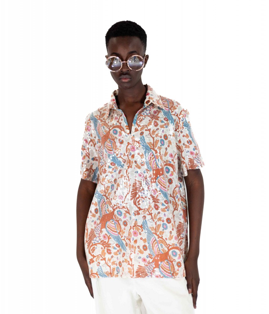 Elegante camisa de lentejuelas multicolores, diseñada para brillar en cualquier evento especial. Su tejido de alta calidad y corte favorecedor la convierten en una pieza única y versátil.