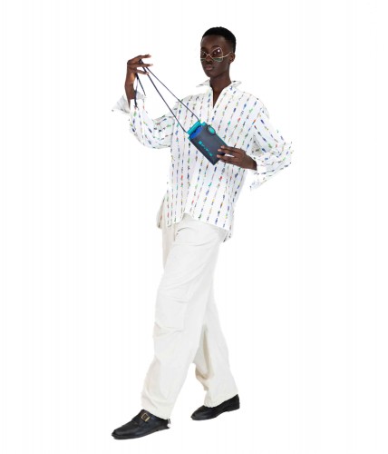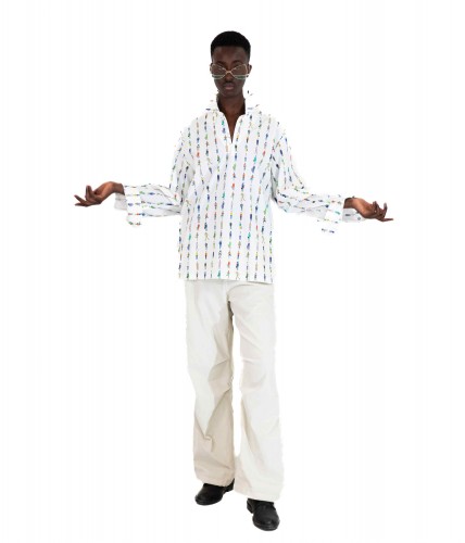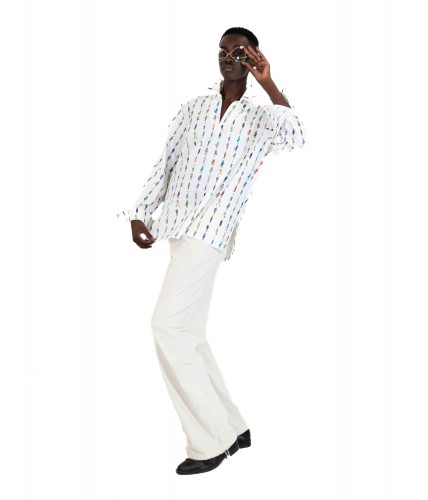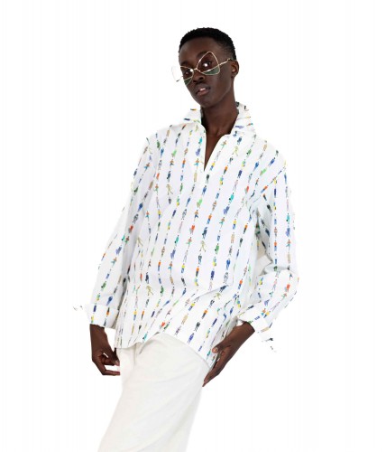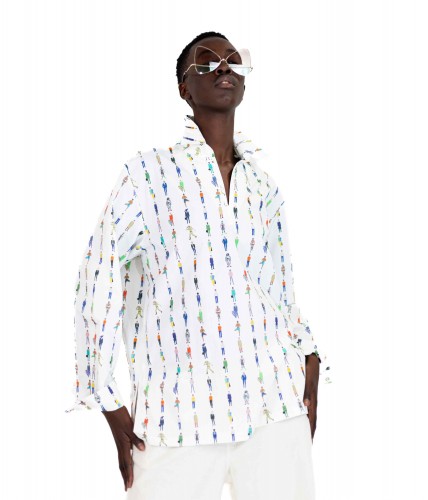Elegante camisa de manga larga confeccionada en suave popelín de algodón. Su diseño destaca por un estampado divertido y original de pequeños hombrecitos, perfecto para añadir un toque de personalidad a cualquier look. El cuello y los puños están acabados en punto de algodón liso, creando un contraste suave y sofisticado. Ideal para ocasiones casuales y formales.