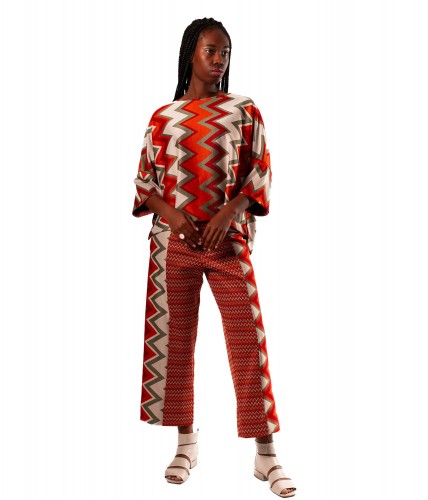 Un pantalón de corte clásico amplio y una cintura ajustada y elástica para una máxima comodidad y libertad de movimiento, con unos cortes laterales que hacen un juego visual que estiliza mucho la silueta.