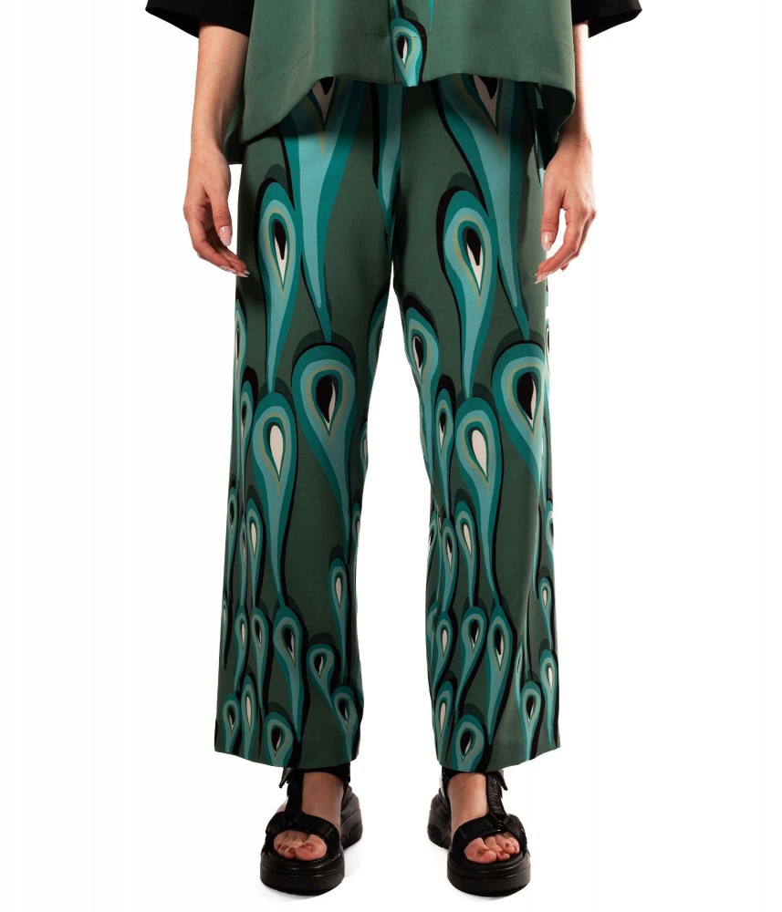 Un pantalón de corte clásico amplio y una cintura ajustada y elástica para una máxima comodidad y libertad de movimiento,realizado en creppe con un estampado muy original y exclusivo