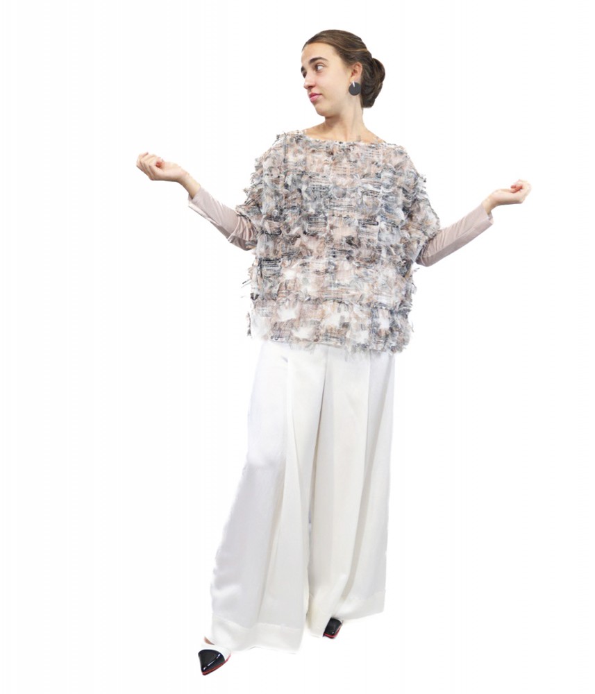 Top fantasía con tela efecto confeti con textura de red, mangas de punto de seda ajustadas.