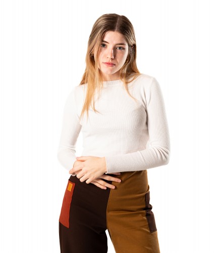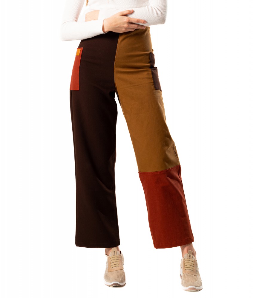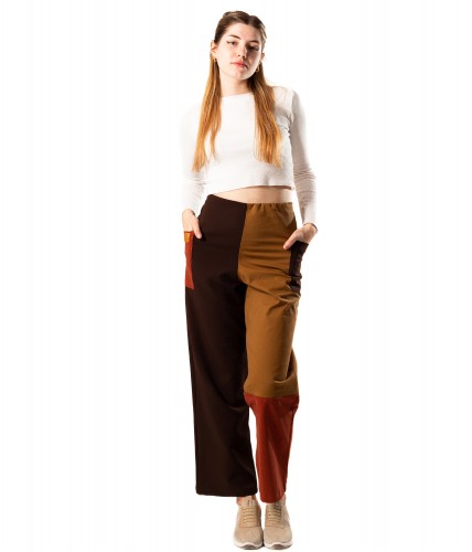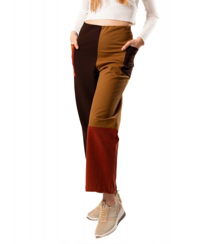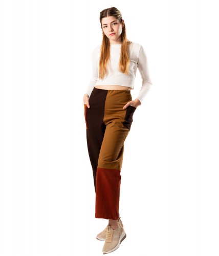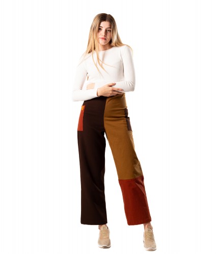 Confeccionado en una suave tela de alta calidad, este pantalón destaca por su diseño innovador. Los detalles en tres colores, estratégicamente ubicados, crean un juego visual que estiliza la figura. Ideal para combinar con prendas lisas o estampadas, aportando un toque de originalidad a cualquier outfit.