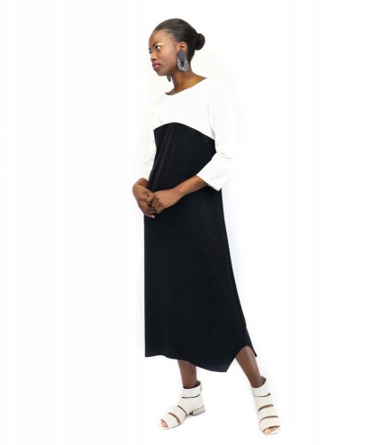 Un contraste cautivador de texturas y colores define este conjunto. El vestido, confeccionado en suave punto de seda negro, fluye con gracia por el cuerpo, creando una silueta atemporal y elegante. El top, en terciopelo blanco, aporta un toque de lujo y sofisticación, resaltando el cuello y los hombros. La combinación del negro y el blanco crea un look clásico y versátil, perfecto para cualquier ocasión especial