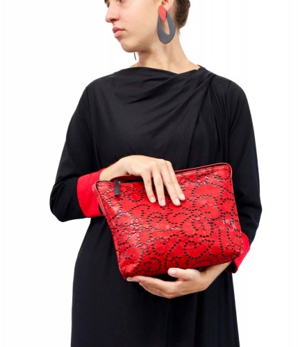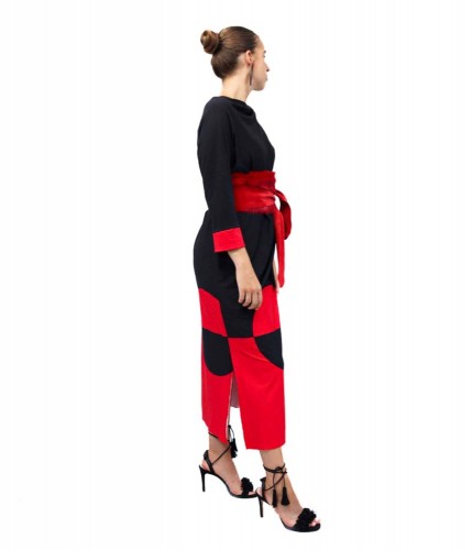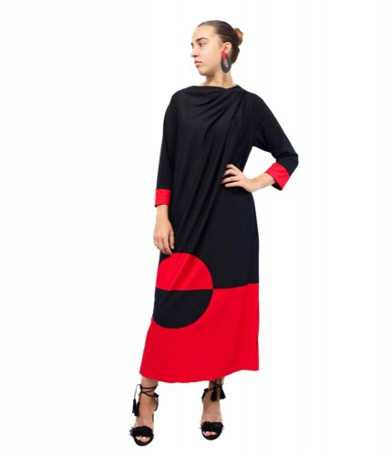 Vestido realizado en punto de seda negro con semicírculo rojo tipo túnica corte recto dos rajas laterales. Manga sastre. Cuello desestructurado con recogido en un hombro.