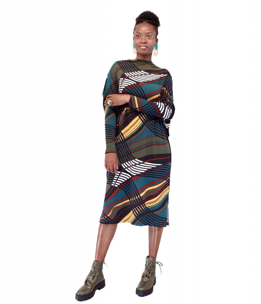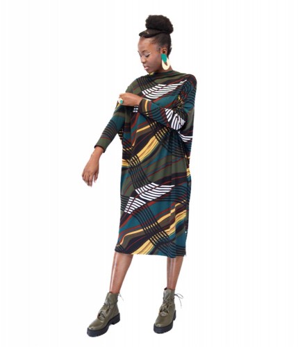 Vestido realizado en punto de seda color verde. Corte recto. Manga japonesa. Cuello chimenea. Dos aperturas laterales. Posibilidad de ajuste con cinturón.
